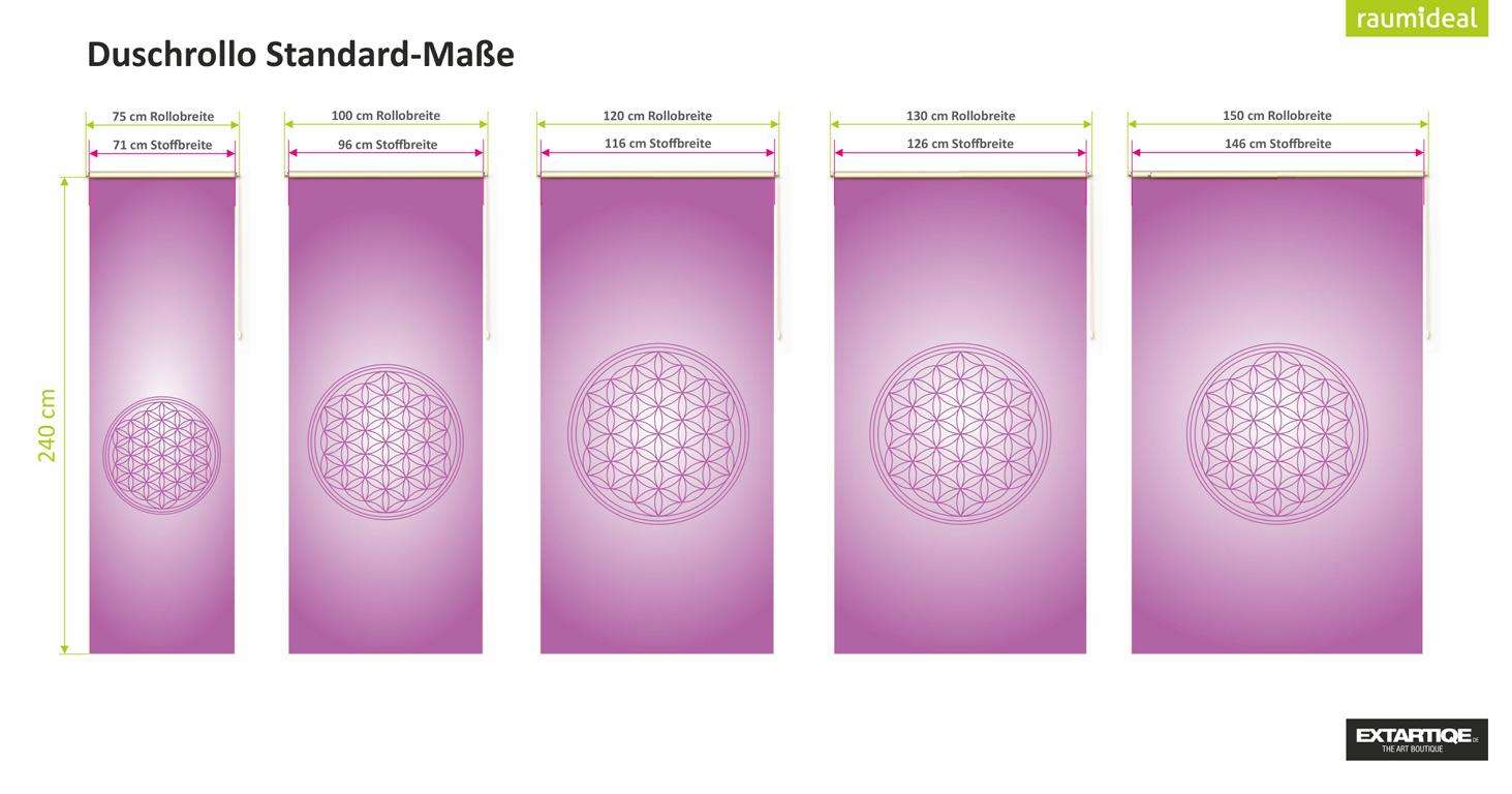Sind Sie zufrieden mit der Technik Ihres aktuellen Extartiqe Duschrollos oder dem Rollo eines anderen Herstellers und möchten diese weiterhin nutzen? Das freut uns zu hören! Wir bieten Ihnen gerne ein Ersatzrollo an. Wählen Sie einfach die passende Breite aus und schon können Sie loslegen! Bitte beachten Sie, dass die angegebenen Breiten die Endmaße des Rollos darstellen. Messen Sie am besten den Stoff Ihres vorhandenen Rollos und bestellen entweder eine Sonderbreite oder, falls es passt, ein Standardmaß. In der obigen Grafik finden Sie die Stoffbreiten für die Rollos in einer Standardbreite. Viel Erfolg beim Ausmessen! Falls Sie dazu Fragen haben,