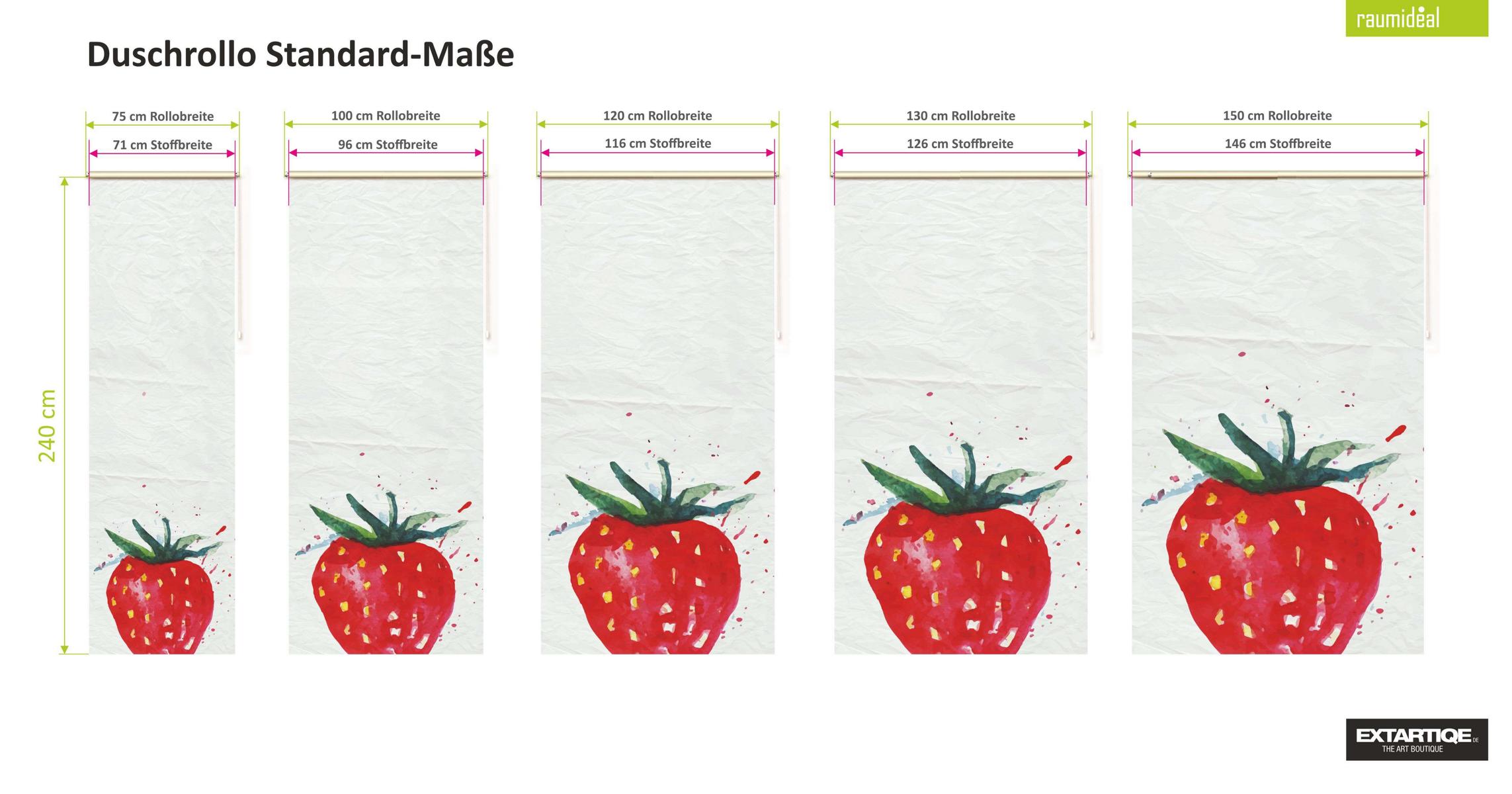 Sind Sie zufrieden mit der Technik Ihres aktuellen Extartiqe Duschrollos oder dem Rollo eines anderen Herstellers und möchten diese weiterhin nutzen? Das freut uns zu hören! Wir bieten Ihnen gerne ein Ersatzrollo an. Wählen Sie einfach die passende Breite aus und schon können Sie loslegen! Bitte beachten Sie, dass die angegebenen Breiten die Endmaße des Rollos darstellen. Messen Sie am besten den Stoff Ihres vorhandenen Rollos und bestellen entweder eine Sonderbreite oder, falls es passt, ein Standardmaß. In der obigen Grafik finden Sie die Stoffbreiten für die Rollos in einer Standardbreite. Viel Erfolg beim Ausmessen! Falls Sie dazu Fragen haben,