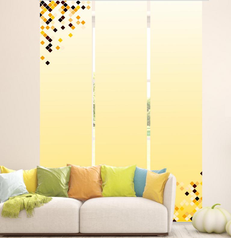 Das Gewebe des Flächenvorhangs besteht zu 100% aus Polyester. Der Druck erfolgt im Sublimationsverfahren und garantiert somit ein Maximum an Langlebigkeit.