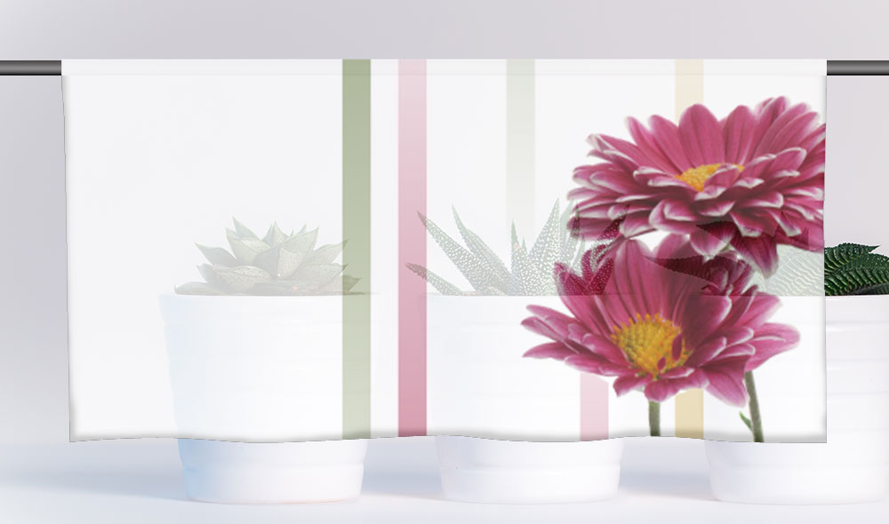 Das Gewebe der Cafehausgardine ist aus 100% Polyester, der Druck ist im Sublimationsverfahren aufgebracht.