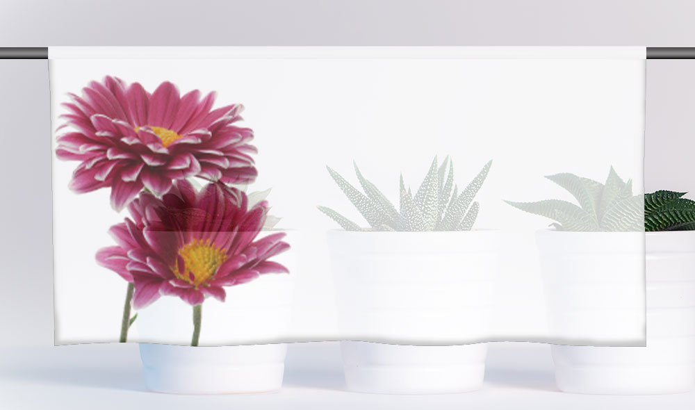 Das Gewebe der Cafehausgardine ist aus 100% Polyester, der Druck ist im Sublimationsverfahren aufgebracht.
