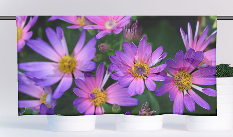 Das Gewebe der Cafehausgardine ist aus 100% Polyester, der Druck ist im Sublimationsverfahren aufgebracht.