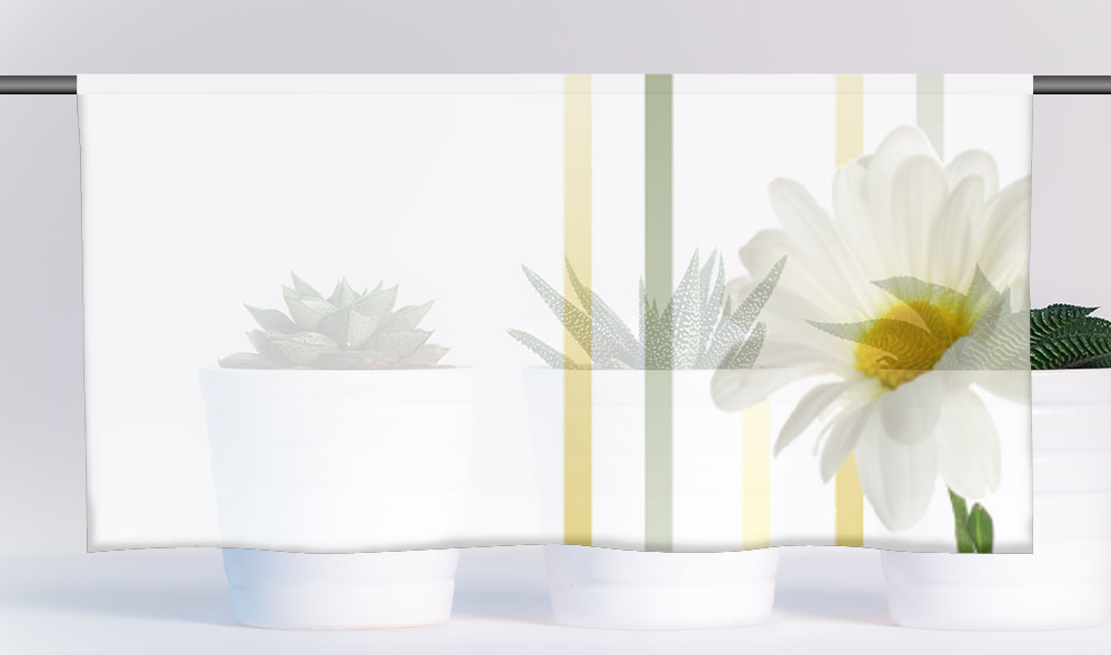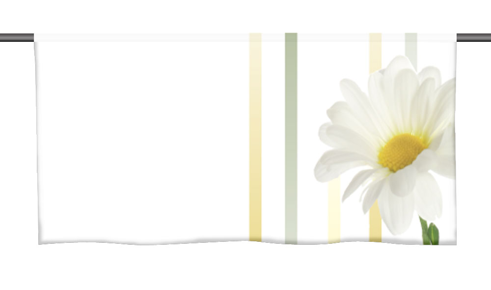 Margarete linia rechts - Eine wunderschöne Margartenblüte mit großen weißen Blütenblättern schmückt diese wundervolle Cafehausgardine und wird als neuer Teil Ihrer Wohnungseinrichtung bestimmt eine tolle Figur abgeben. Als neuer Fensterschmuck wird diese Blüte eine tolle Atmosphäre in Ihrem Wohnraum erzeugen.