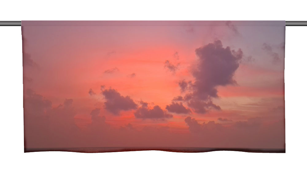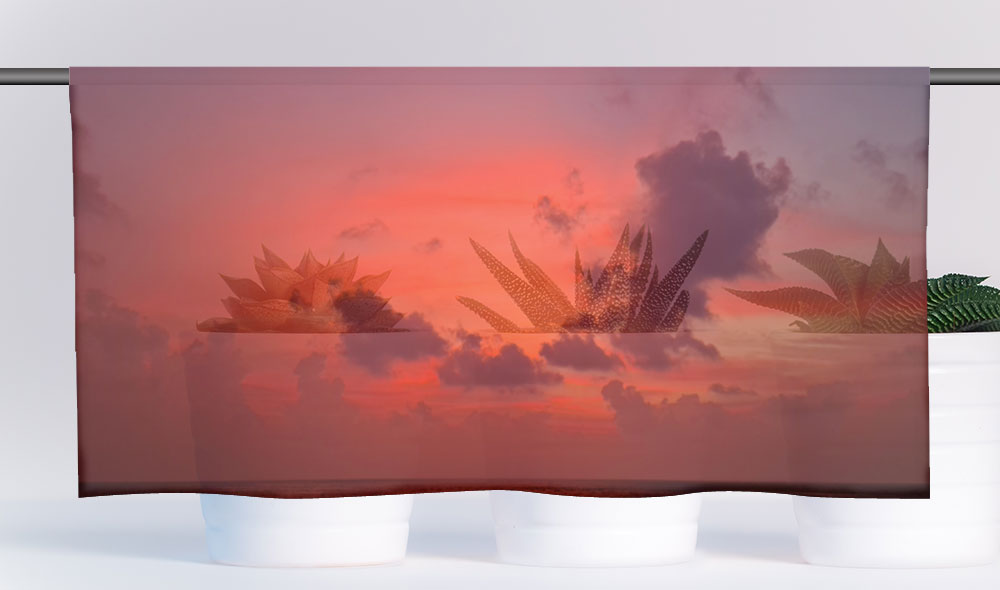 Das Gewebe der Cafehausgardine ist aus 100% Polyester, der Druck ist im Sublimationsverfahren aufgebracht.