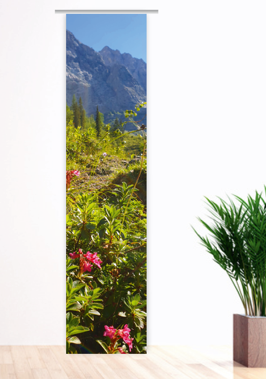 Mit diesem wundervollen Flächenvorhang werden Sie Ihrer Wohnung wieder neuen Schwung verleihen. Bestimmt ist das auch wiedermal notwendig. Neue Farben und neue Motive werden den Wohnraum komplett verändern. Eine neue Atmosphäre wird darin entstehen. Als neue Fenster-Dekoration wird er ein Blickfang für jeden Betrachter werden. Sein Motiv holt die Natur direkt in Ihre Wohnung. Rot blühen die Blumen auf der hohen Alm, umgeben von den hohen Bergen der Alpen. Ein tolles Panorama, welches dieses Motiv einfängt. In unserer thüringischen Gardinen-Collektion werden Sie noch viele tolle Ideen rund um das Fenster finden, die Sie in iÍhrer Wohnung umsetzen können.