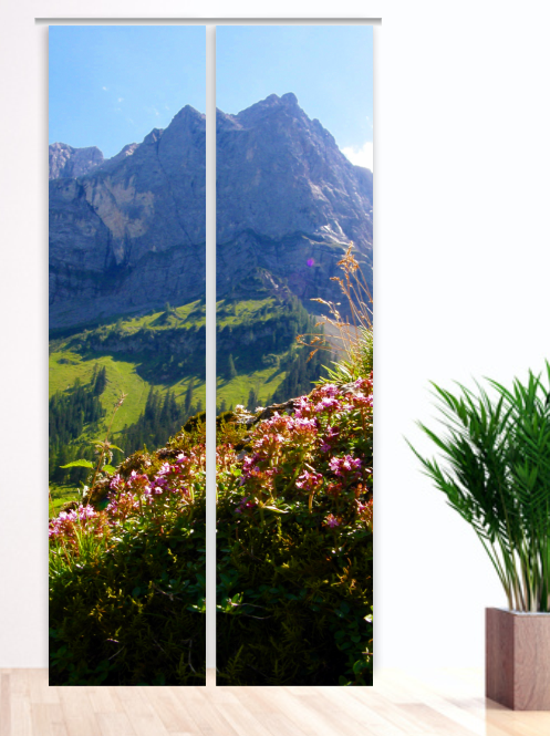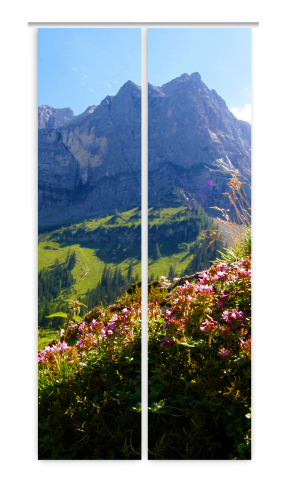 Jetzt ist wiedermal Zeit, um etwas Neues in Ihre Wohnung zu bringen. Fehlen Ihnen die Ideen? Dann sind Sie in unserer hauseigenen Gardinen-Collektion aus Thüringen mit Sicherheit richtig. Hier finden Sie tolle Ideen rund um das Fenster. Eine Fenster-Dekoration bestimmt den Charakter einer Wohnung. Verändern Sie hier etwas, dann verändern Sie das Gesicht Ihrer Wohnung. Eine neue Fenster-Dekoration bringt neue Farben und Motive in den Wohnraum. So auch dieser elegante Flächenvorhang mit seinem bezaubernden Naturmotiv. Bergmassive ragen im Hintergrund in den blauen Himmel. Im Vordergrund bringen die blühenden Pflanzen Farbe ins Bild. Dazwischen breitet sich das Grün der Wiesen und Wälder aus.