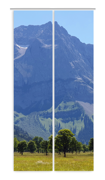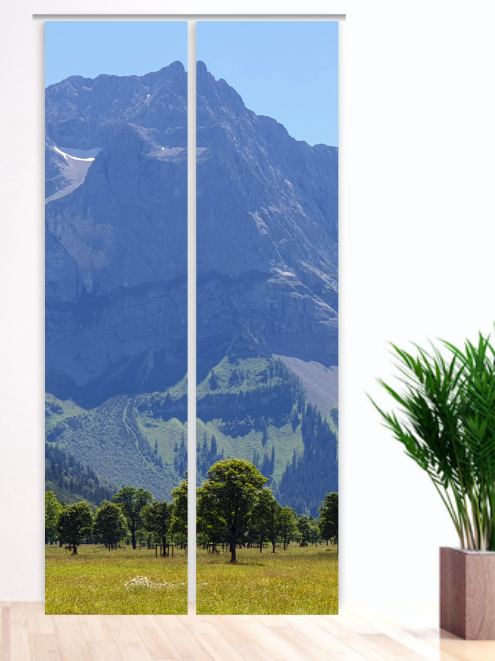 Mit diesem besonderen Flächenvorhang aus unserer hauseigenen Gardinen-Collektion aus Thüringen werden Sie Ihren Wohnraum neu beleben und verändern. Neuer Schwung wird hineinkommen. Neue Farben und Motive werden die Atmosphäre positiv verändern und ein tolles Wohngefühl erzeugen. Als neue Fenster-Dekoration wird er komplett überzeugen. Mit seinem Naturmotiv wird er die Blicke vieler Betrachter auf sich ziehen. Grüne Wiesen, grüne Bäume und Wälder, dazu die sich in den Himmel erhebenden massiven Felsen der Alpen, da kommt man unweigerlich ins staunen. So wird es vielen gehen, die dieses Motiv betrachten. Sie werden begeistert sein.