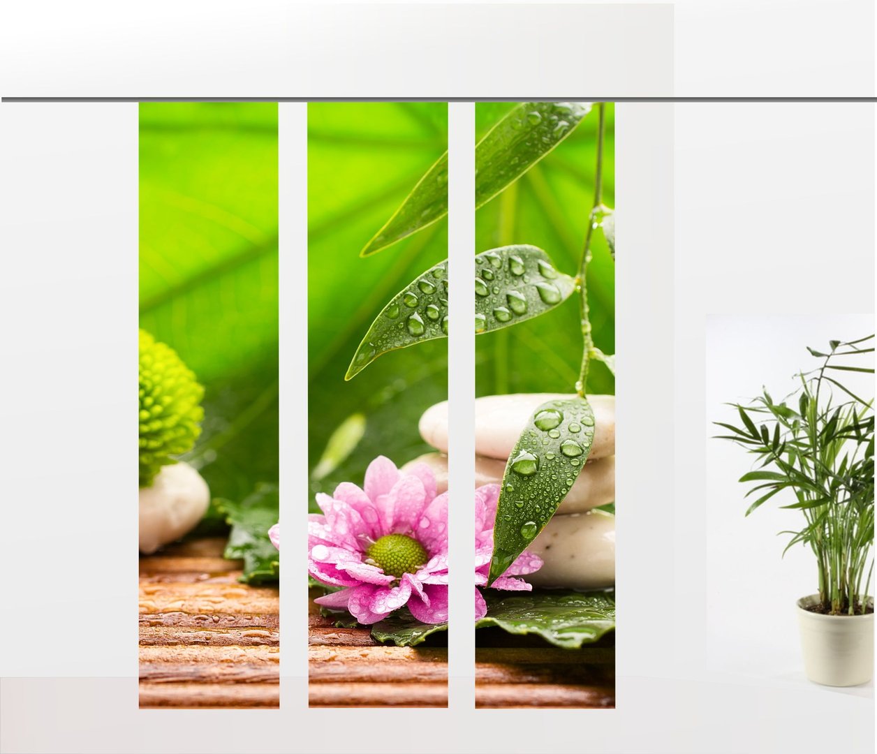 Dieses beeindruckende Flächenvorhang-Set mit seinen intensiven Farben eignet sich hervorragend für Wellness- und Ruheräume, verleiht jedoch auch jedem Wohnzimmer eine besondere Note.