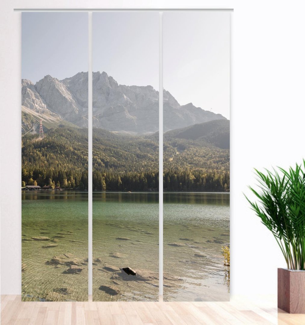 Die Qualität sollte in Ihrer Wohnung stets eine bedeutende Rolle spielen. In unserer exklusiven Gardinenkollektion, die in Thüringen gefertigt wird, finden Sie höchste Qualität in allen Bereichen. Nehmen Sie sich die Zeit, diesen exquisit gestalteten Flächenvorhang in Ruhe zu betrachten. Sein auffälliges Motiv zieht sofort die Blicke auf sich. Als neue Fensterdekoration wird er sicherlich einen besonderen Platz in Ihrem Zuhause finden. Ein beeindruckendes Panorama ziert diesen Vorhang. Der Blick schweift vom kristallklaren Wasser im Vordergrund hin zu den kahl emporragenden Berggipfeln im Hintergrund. Wälder schlängeln sich am Fuße der Berge entlang und verleihen dem Bild zusätzliche Farbtupfer. Diese Wahl wird zweifellos ein Volltreffer für Ihr Zuhause sein.