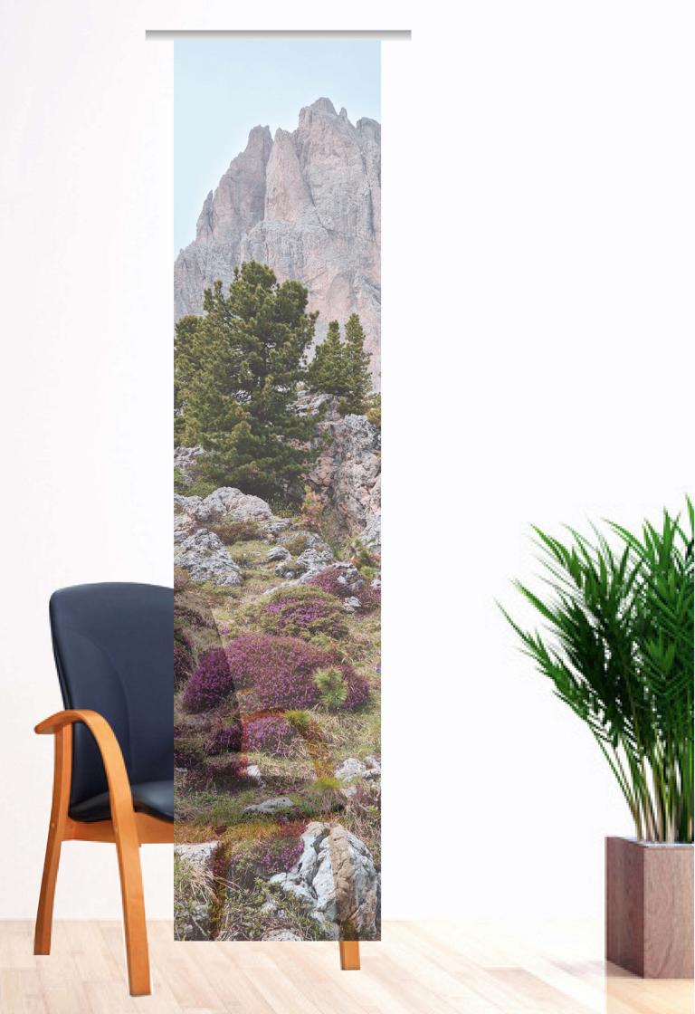 Wie gefällt Ihnen denn dieser wunderschöne Flächenvorhang? Wäre das nicht etwas für Ihre Wohnung? Als neue Fensterdekoration wird er bestimmt schnell die Blicke auf sich ziehen. Dafür sorgt das faszinierende Motiv aus den Alpen. Eine Bergheide vor den Felsmassiven der Alpen. Da kommt die Natur direkt in Ihre 4 Wände. Das sollte doch passen.