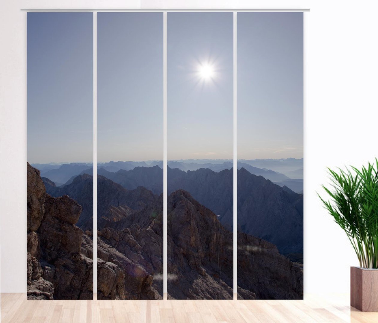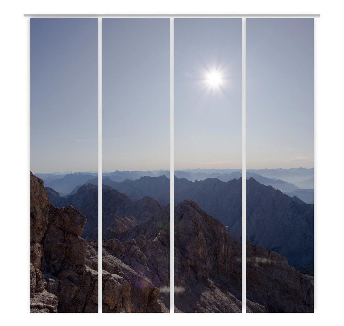 Charakteristisch für eine Wohnung sind in der Regel ihre Gardinen. Diese bestimmen auch die Atmosphäre darin und sorgen für ein angenehmes Wohnklima. Dieser bezaubernde Flächenvorhang aus unserer hauseigenen Gardinen-Collektion aus Thüringen besticht durch sein atemberaubendes Motiv. Vielleicht haben Sie auch schon diesen Ausblick gehabt. Jedenfalls ist dieser Blick über die Gipfel der Berge kaum zu toppen. Die untergehende Sonne taucht das ganze Ensemble in ein faszinierendes Licht. Stellen Sie sich dieses Motiv in Ihrer Wohnung vor. Wäre das nicht ein absoluter Hingucker und ein Highlight in Ihrer Wohnung? Dann sollten Sie nicht länger warten! Sie werden es nicht bereuen.