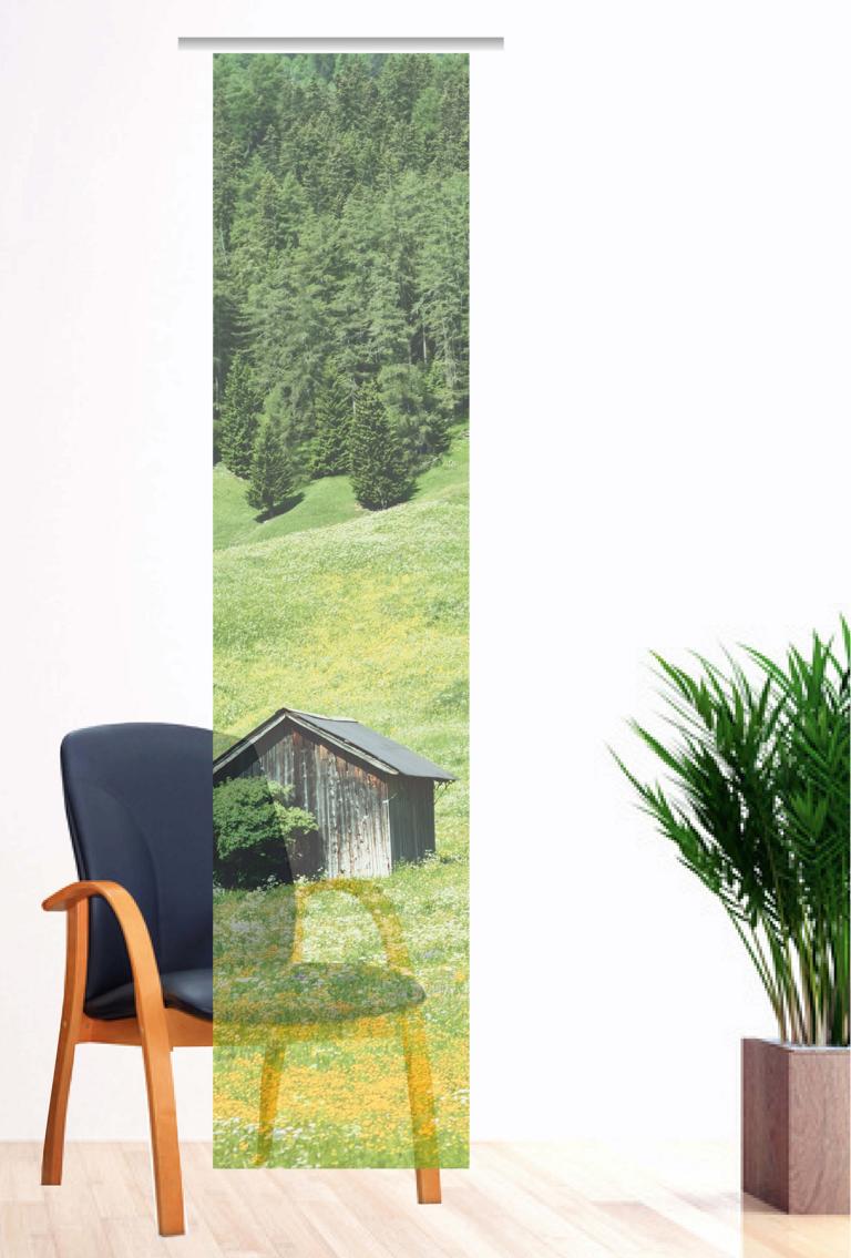 Dieser wundervolle Flächenvorhang sollte doch einen Platz in Ihrer Wohnung bekommen. Als neue Fensterdekoration bringt er nicht nur neue Farben und Motive in den Wohnraum, er holt auch die Natur direkt in Ihre Wohnung. Eine Berghütte mitten auf der Alm vor üppig 1grünen Wäldern ist ein beeindruckendes Motiv, welches nicht nur Ihnen gefallen wird.
