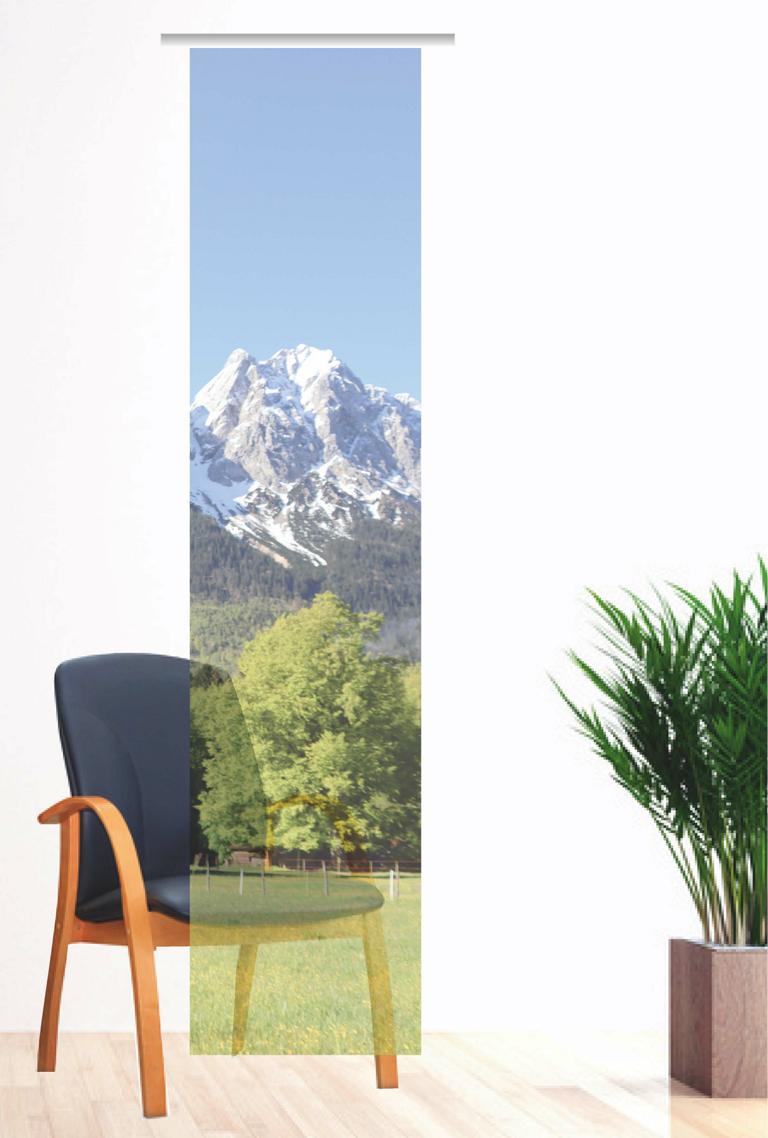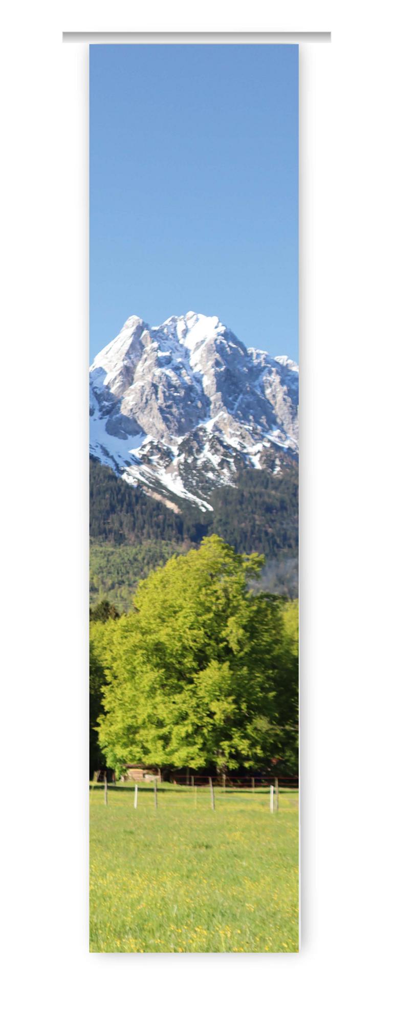 Welch ein beeindruckendes Panorama ziert diesen außergewöhnlichen Flächenvorhang. Die Natur kommt mit ihm in Ihre Wohnung. Als neue Fensterdekoration könnte er ein Blickfang in Ihrer Wohnung werden. Der Blick geht über die Wiese mit den grünen Bäumen auf die schneebedeckten Berggipfel der Alpen. Wenn das nicht überzeugt.