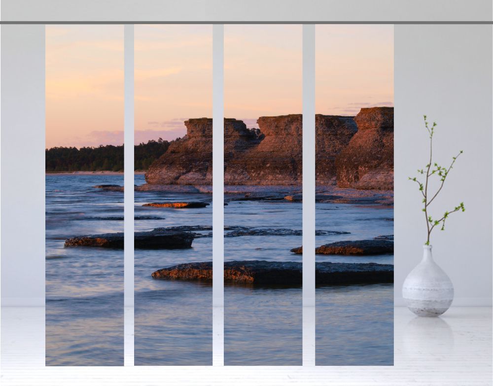 Hier finden Sie einen genialen Flächenvorhang, auch Schiebegardine genannt. Das Motiv aus dem hohen Norden, aus Skandinavien, lädt zum hinschauen ein. Felsen, vom Wasser und Wind geformt, vor der Kulisse der untergehenden Sonne prägen das Bild. Genial zum abschalten und erholen. Lassen Sie die leuchtenden Farben auf sich wirken. Rundherum ein Genuss und ein echtes Highlight für Ihren Wohnraum.