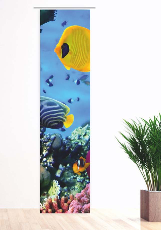 Das Gewebe des Flächenvorhangs besteht zu 100% aus Polyester, die Bedruckung erfolgt im Sublimationsverfahren und garantiert somit ein Maximum an Langlebigkeit.