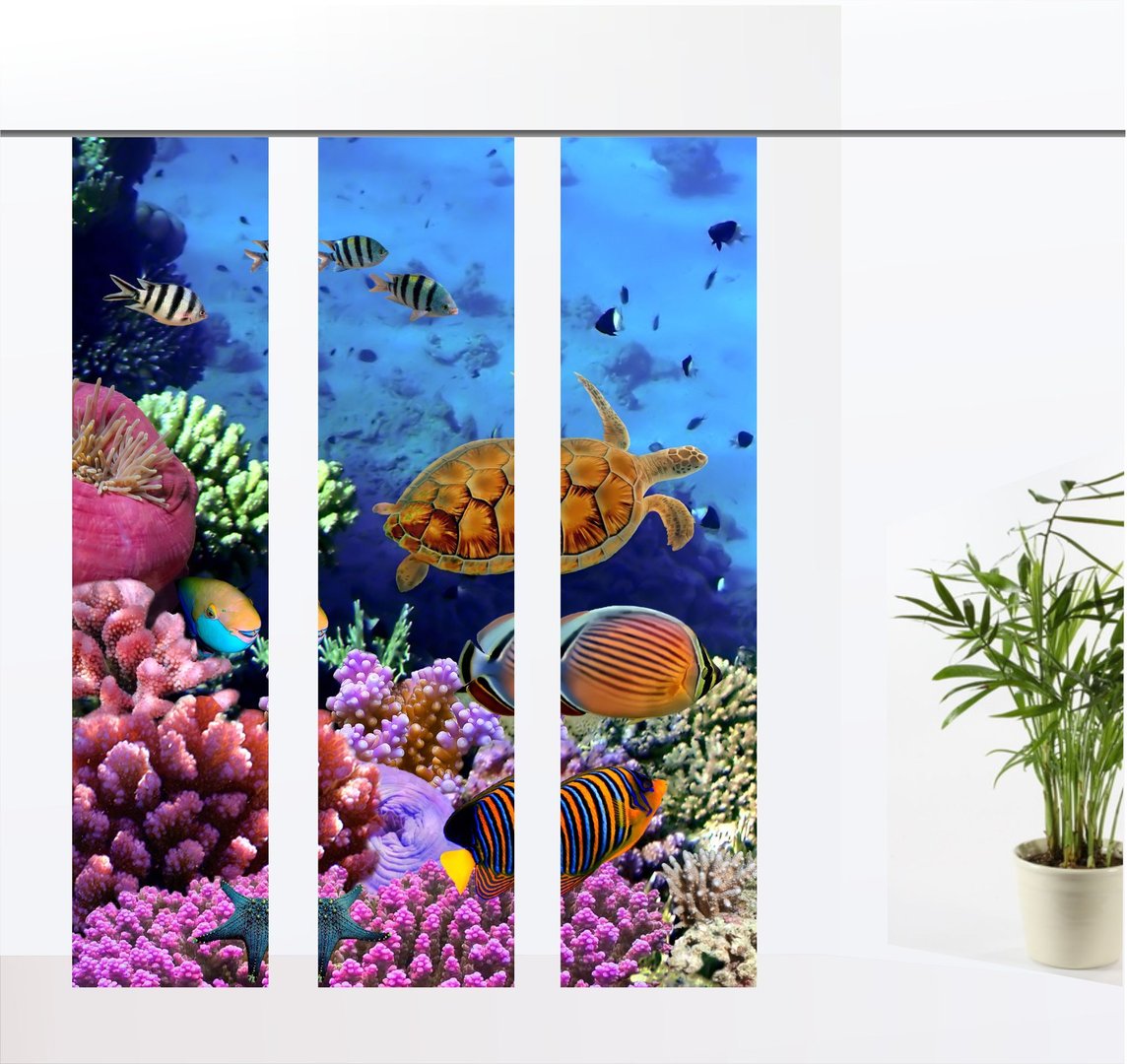 Diese herrliche Flächenvorhang-Serie mit ihren strahlenden blauen Farben bezaubert auf ganz besondere Weise. Schildkröten, Korallen, Südseefische und eine Fülle von Wasser kommen wunderbar zur Geltung und bringen viel Freude sowie Farbe in Ihre Wohnung.