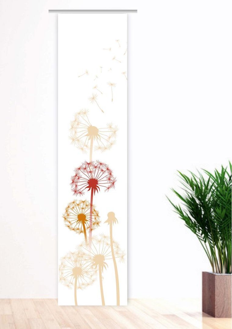 Super! Wenn Sie Ihrer Wohnung etwas Gutes tun wollen, dann sollten Sie an diesem bezaubernden Flächenvorhang aus unserer thüringischen Gardinen-Collektion nicht vorbei kommen. Bestimmt haben Sie schon ein Fenster vor Augen, an dem dieses Exemplar besonders gut zur Geltung kommen wird. Ein wunderschönes Natur-Schauspiel bestimmt das Motiv dieses Flächenvorhanges. Die Pusteblume mit ihren kleinen schirmartigen Sporen bekommt durch die verschiedenen Farbtöne und dem herausstechenden rötlichen Exemplar eine besondere Note. Zumal werden hier Erinnerungen aus der eigenen Kindheit wach, die Sie täglich beim Blick aus dem Fenster genießen und wachhalten können.