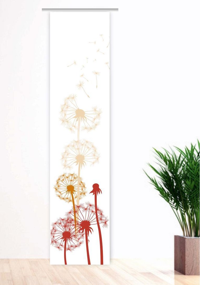 Dieser geniale Flächenvorhang aus unserer eigenen Gardinen-Collektion Made in Thüringen könnte schon bald Teil Ihrer Wohnungseinrichtung werden. Als neue Fenster-Dekoration wird er bestimmt neuen Schwung in Ihre Wohnung bringen und Sie perfekt auf den kommenden Frühling einstellen. Pusteblumen bilden den Schwerpunkt dieses Motives. Die verschiedenen Farben, von den kräftigen rötlichen Farbtönen bis zu den blassen gelbfarbenen, machen das Motiv sehr lebendig. Bestimmt werden beim Betrachten auch eigene Kindheitserinnerungen wach, die Sie mit diesem Flächenvorhang perfekt einfangen können. Das wird bestimmt ein Hingucker in Ihrer Wohnung werden.