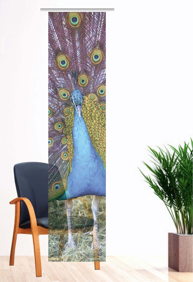 Neue Farben und Motive können einer Wohnung neuen Schwung geben und sie nachhaltig verändern. Dieser prächtige Flächenvorhang wird ein absoluter Blickfang in Ihrer Wohnung werden. Der Pfau mit seinem prächtigen Federkleid bestimmt das Bild und fesselt den Blick der Betrachter. Da muss man einfach hinsehen. Das sollte Sie doch überzeugen.