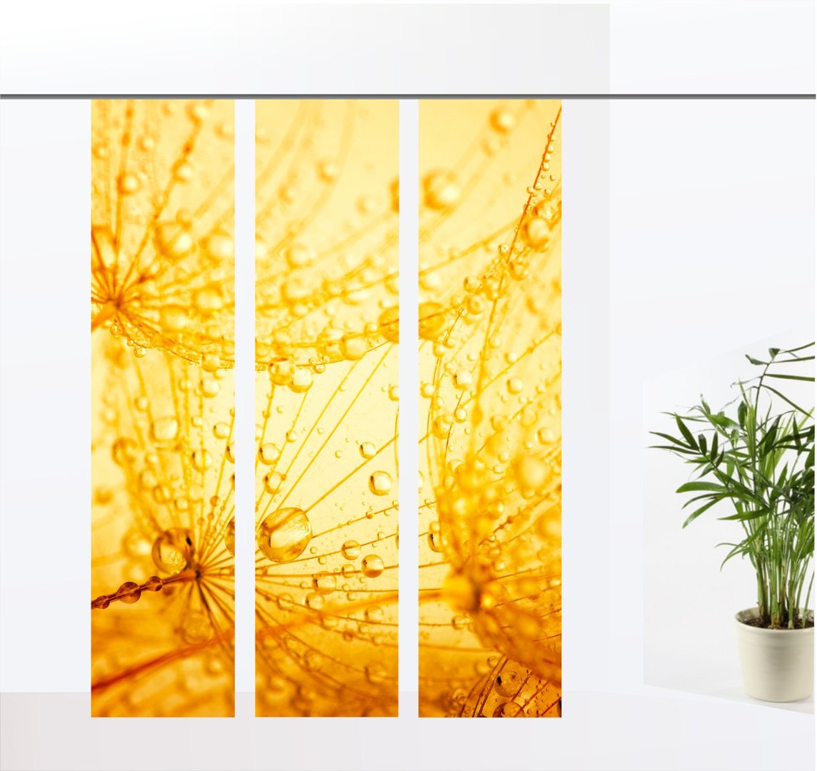 Das Gewebe des Flächenvorhangs besteht zu 100% aus Polyester. Der Druck erfolgt im Sublimationsverfahren und garantiert somit ein Maximum an Langlebigkeit.