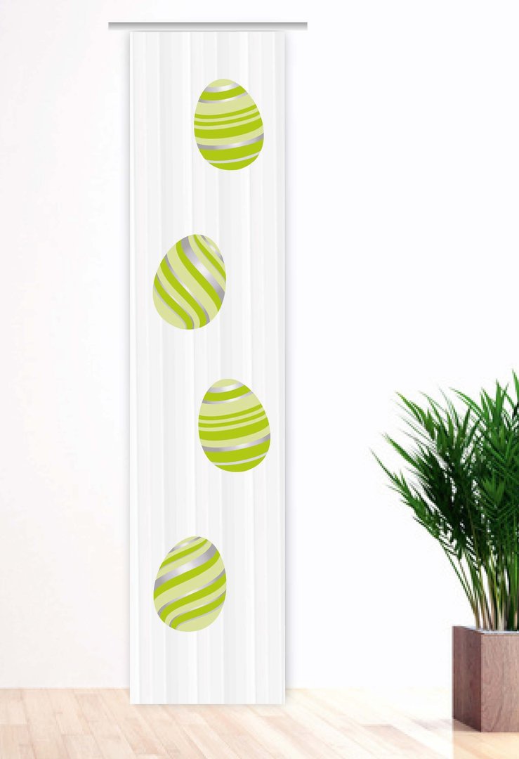 Überragend ist dieser Flächenvorhang aus unserer eigenen Gardinen-Produktion Made in Thüringen. Und ein besonders insterressantes Exemplar für die bevorstehende Osterzeit. Als neue Fenster-Dekoration werden die übergroßen grünen Ostereier eine gute Figur machen und Ihre Wohnungseinrichtung perfekt ergänzen.