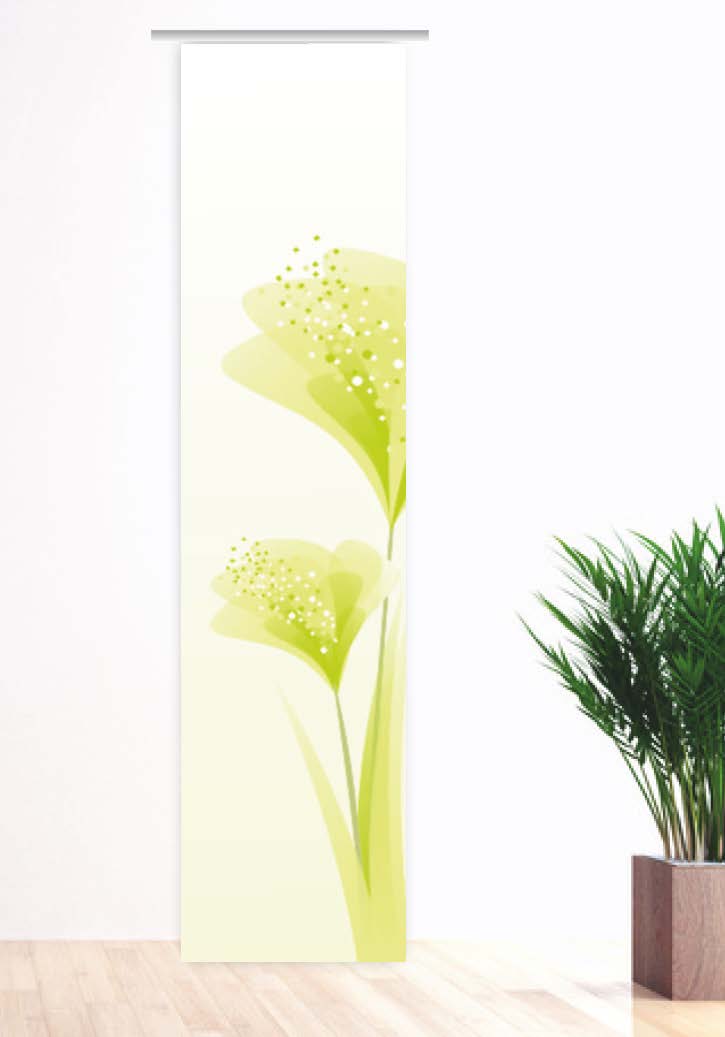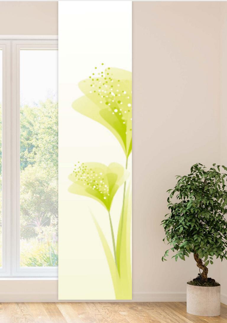 Neue Farben und neue Motive verändern Ihren Wohnraum nachhaltig. Dieser wunderschöne Flächenvorhang wird dazu beitragen. Sein beeindruckendes Blumenmotiv fällt sofort ins Auge. Große, grüne Blütenkelche kommen auf dem weißen Untergrund hervorragend zur Geltung.