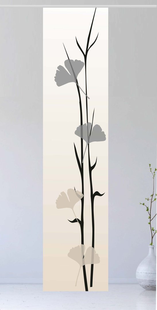 Sie suchenn etwas Besonderes für Ihre Wohung? Vielleicht eine neue Fenster-Dekoration? Dann schauen Sie sich in Ruhe diesen wunderchönen Flächenvorhang aus unserer hauseigenen Gardinen-Collektion an. Das einfache Pflanzenmotiv mit seiner schlichten grauen Farbgebung strahlt eine besondere Atmosphäre aus.