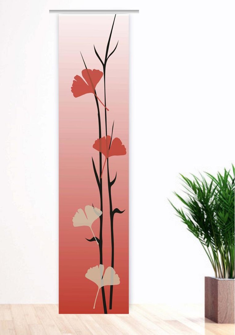 Bestimmt haben Sie schon über Veränderungen in Ihrer Wohnung nachgedacht, oder etwa nicht? Dann sollten Sie schnellstens damit beginnen, denn am Anfang eines neuen Jahres sollte doch etwas Neues in Ihrer Wohnung Einzug halten. Eine neue Fenster-Dekoration wäre doch ein Anfang. Mit diesem Klasse Flächenvorhang aus unserer eigenen Gardinen-.Collektion Made in Thüringen werden Sie ein neues Highlight darin schaffen. Ein überzeugendes Pflanzenmotiv bestimmt das Bild. Seine abstrakte Darstellung wirkt sehr neutral für jede Wohnungseinrichtuing. Ein Farbverlauf als Hintergrund sorgt dafür, dasss die Zweige und überdimensionalen Blätter im Vordergrund gut zur Geltung kommen. Die rötlichen Farbtöne runden das Gesamtbild perfekt ab.