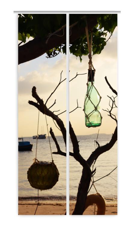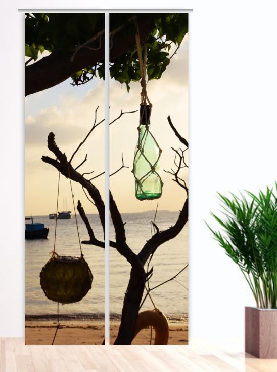 Mit diesem faszinierenden Flächenvorhang bringen Sie eine neue Atmosphäre in Ihre Wohnung, die sie nachhaltig verändern wird. Der Blick geht von einer Strandbar auf das offene Meer. Glasgefäße hängen herab und beleben das Motiv. Die Südsee, speziell die Malediven, halten Einzug in Ihrer Wohnung.