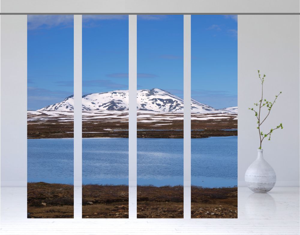 Hier finden Sie einen ertklassigen Flächenvorhang, auch Schiebegardine genannt. Das Motiv aus dem hohen Norden, aus Skandinavien, lädt zum entspannen ein. Ein schneebedeckter Berg hinter dem See prägen das Bild. Wunderbar geeignet zum entspannen und ausruhen. Lassen Sie die leuchtenden Farben auf sich wirken. Rundherum ein Genuss und ein Highlight für Ihren Wohnraum.