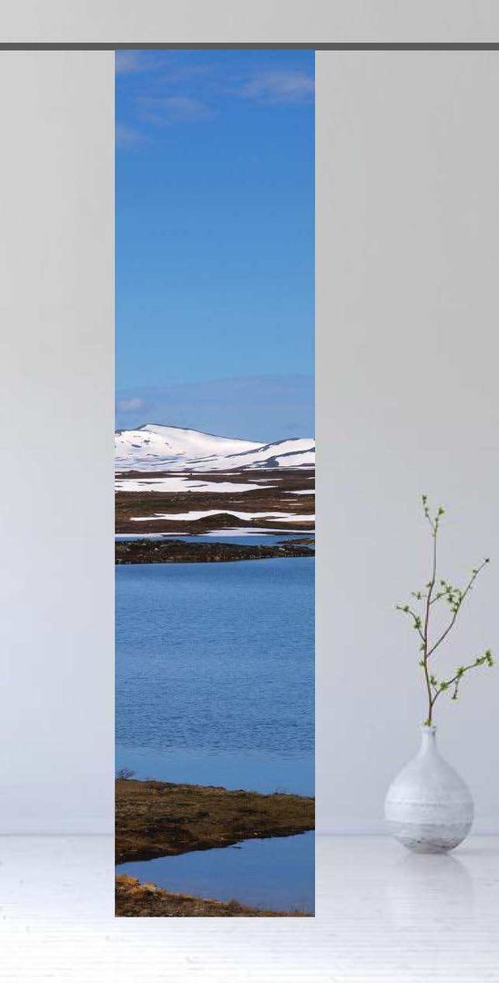 Schneebdeckte Berge vor der kargen Landschaft des rauhen Nordens bilden das Motiv dieses Flächenvorhanges, dessen leuchtende Farben perfekt zu ihrer Einrichtung passen werden. Lassen Sie sich Zeit zum entspannen und träumen.