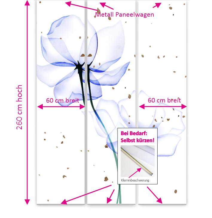 Die Flächengardinen sind für verschiedene Fenstergrößen erhältlich. Auf Anfrage können Sie auch individuelle Größen bestellen. Die Vorhänge sind ein echter Hingucker, egal, ob sie als Raumteiler, Wandbild oder Fensterdekoration im Einsatz sind.