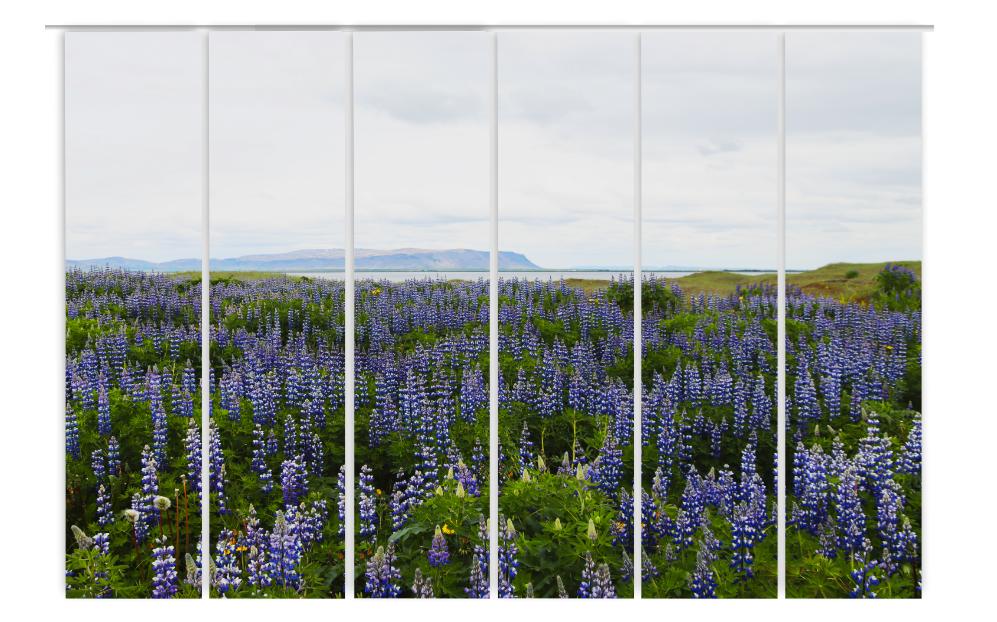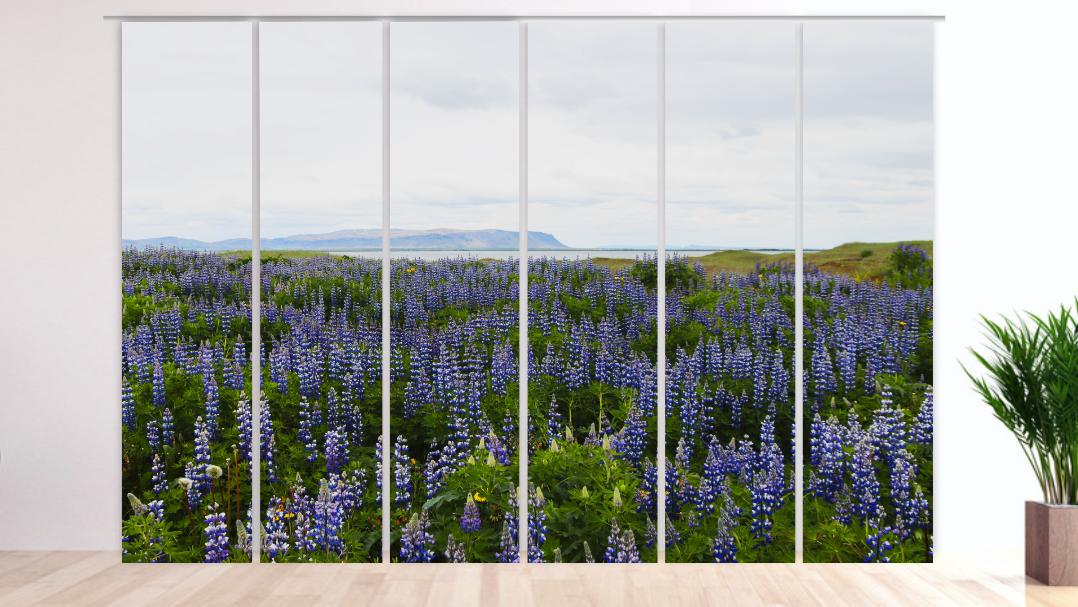 Mit diesem wunderschönen Motiv holen Sie sich die traumhaft schöne Landschaft Islands direkt in Ihre 4 Wände. Das Lupinienfeld mit seinen bläulichen Blüten macht den Blick frei auf das dahinterliegende Meer. Welch ein Anblick. Als neue Fensterdekoration wird dieser Flächenvorhang schnell Freunde finden. Auch Sie werden begeistert sein.
