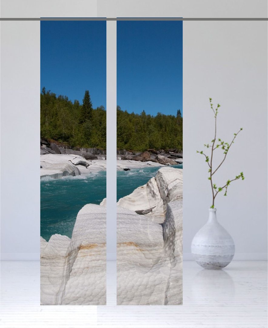 Gebirgswasser schlängelt sich ins Tal, vorbei an Kiefern und Felsen - ein faszinierendes Bild und prächtiges Motiv für diesen wunderschönen Flächenvorhang. Lassen Sie sich verzaubern von der wilden Natur des Nordens.