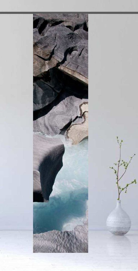 Ein Gewirr aus Felsen und Wasser eines reißenden Gebirgsbaches bildet das Motiv dieses Flächenvorhanges, dessen leuchtende Farben perfekt zu ihrem Einrichtungsstil passen werden. Lassen Sie sich verzaubern und finden Sie Zeit zum träumen und entspannen.