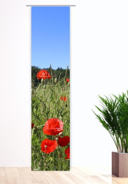 An diesem Flächenvorhang aus unserer eigenen Gardinen-Collektion Made in Thüringen werden Sie lange Ihre Freude haben. Sein wundervolles Naturmotiv mit seinen tollen Farben wird Ihren Wohnraum nachhaltig und grundlegend verändern. Eine neue Atmosphäre wird sich einstellen und das Wohnen wieder zum Vergnügen machen. Haben Sie schon das passende Fenster vor Augen? Bestimmt wird dieser Flächenvorhang seinen Platz in Ihrer Wohnung bekommen. Eine Wiese mit blühenden Mohnblumen ziert das Motiv. Die Blüten leuchten in Ihrer wunderschönen roten Farbe. Da möchte man einfach nur hinschauen und genießen. Ein Voltreffer für Ihre Wohnung, mit Sicherheit.