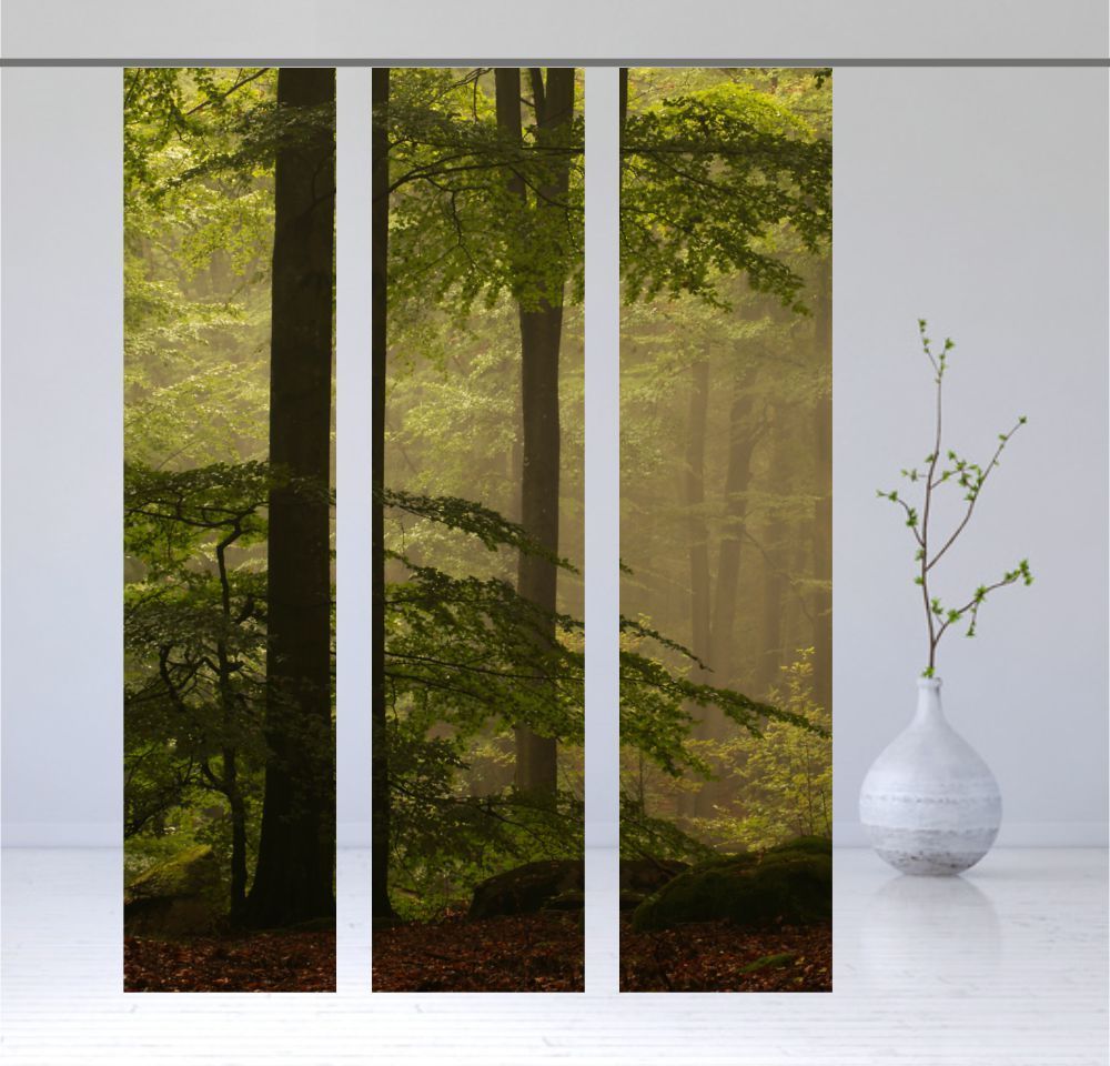 Hier ist ein wunderschöner Flächenvorhang aus der Nordwald 3er Serie, der Sie in die faszinierende Natur des Nordens, nach Skandinavien, entführt. Das Motiv, bestehend aus Bäumen, Licht und sattem Grün, lädt zum Verweilen und Entspannen ein. Es ist perfekt geeignet, um abzuschalten und sich zu erholen. Lassen Sie die beeindruckenden Farben auf sich wirken und genießen Sie die Atmosphäre in vollen Zügen.