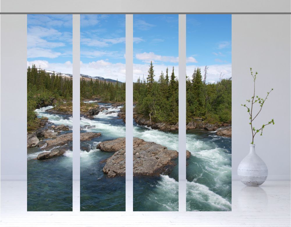 Hier sehen Sie einen genialen Flächenvorhang, auch Schiebegardine genannt. Das bezaubernde Motiv aus dem hohen Norden, aus Skandinavien, lädt zum abschalten und verweilen ein. Wasser eines wilden Gebirgsfluuses schlängelt sich zwischen Felsen und Wäldern hindurch und prägt dieses Bild. Sehr gut geeignet zum entspannen und ausruhen. Lassen Sie die faszinierenden Farben auf sich wirken. Rundherum ein Genuss und ein echter Hingucker für Ihren Wohnraum.