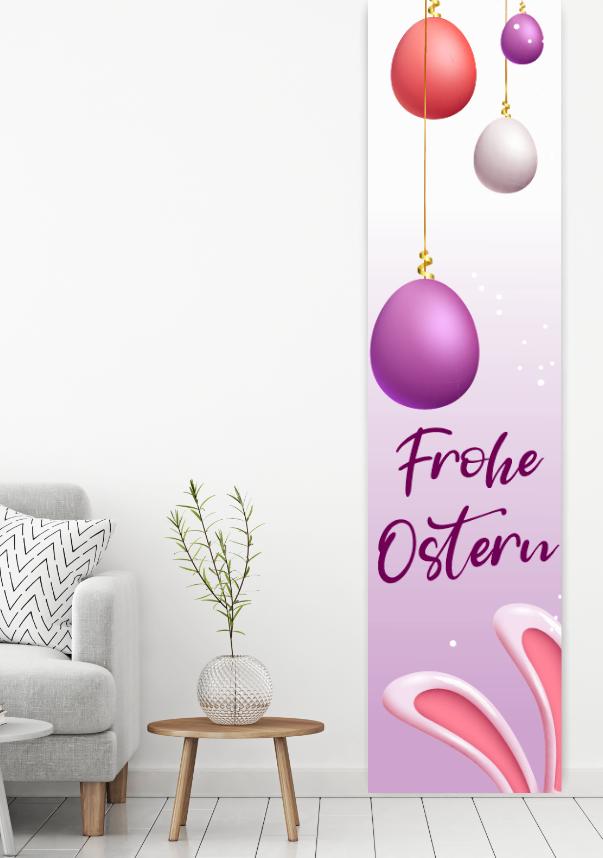 An diesem wunderschönen Flächenvorhang werden Sie bestimmt Ihre Freude haben. Zum einen ist er die wohl passende Fensterdekoration für die Osterzeit, zum anderen kommen mit ihm neue Farben und Motive in den Wohnraum, die diesen nachhaltig verändern werden. Große Ostereier in weißen, roten und lila-nen Farben bestimmen das Bild. Der Hintergrund ist als Farbverlauf gestaltet und bringt Bewegung in den Wohnraum.
