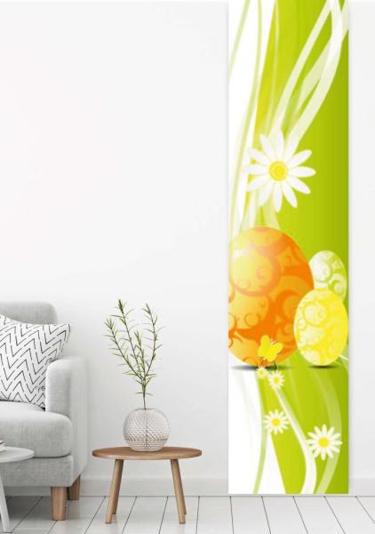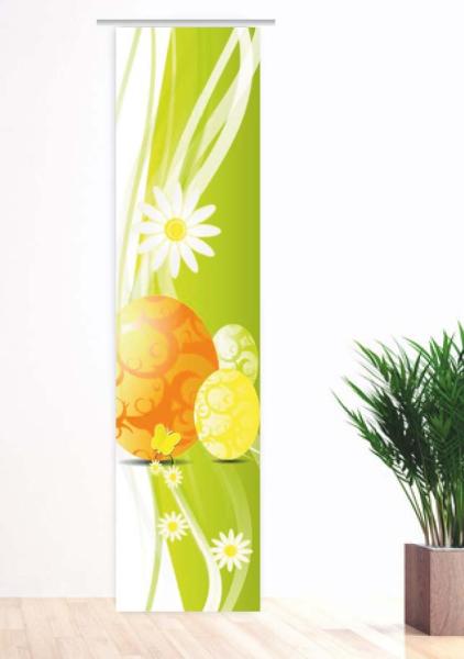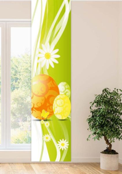 Welch ein wunderschönes Motiv für die Osterzeit. Ein farbenfroher Flächenvorhang, der Ihren Wohnraum nachhaltig verändern wird. Auf dem grünen Untergrund kommen die farbigen Motive bestens zur Geltung. Das wird Ihnen bestimmt viel Freude machen.