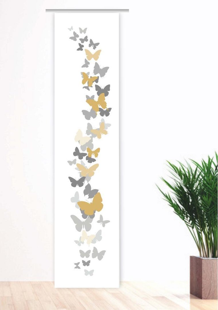 Wenn der Frühling kommt sollten Sie und Ihre Wohnung doch darauf vorbereitet sein, oder nicht? Bringen Sie Ihre Wohnung auf Schwung mit einer neuen Fenster-Dekoration aus unserer hauseigenen Gardinen-Collektion aus Thüringen. Mit diesem Flächenvorhang werden Sie die Natur in Ihre 4 Wände holen. Ein wunderschönes Schmetterlings-Motiv ziert dieses Exemplar und wird für frischen Wind darin sorgen. Eine ganze Schar an grauen und goldenen Schmetterlingen wird durch Ihre Wohnung flattern und Ihnen Lust auf Natur machen. Da kann man nicht einfach ruhig sitzen bleiben. Aber den Anblick können Sie täglich genießen beim Blick aus dem Fenster. Da wird wohl manch Betrachter neidisch werden.