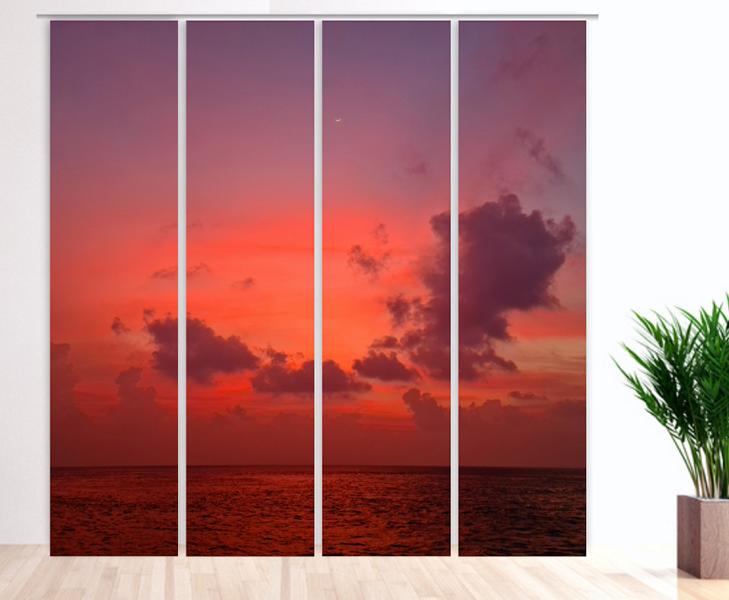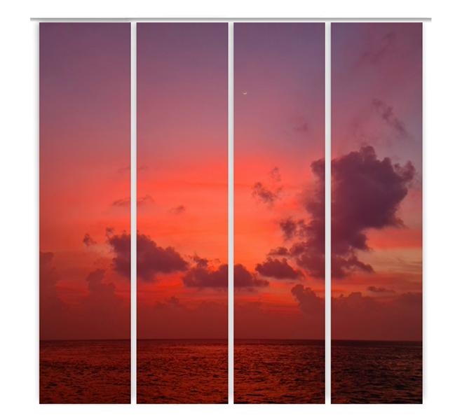 Purpurfarben färbt sich der Abendhimmel über der Südsee und taucht die Landschaft in tolle Farben. Eine einzigartige Stimmung entsteht, die Sie sich mit diesem perfekt gestalteten Flächenvorhang direkt in Ihre Wohnung holen können. Hier passt einfach alles zusammen. Sie werden mit Sicherheit Ihre Freude daran haben.