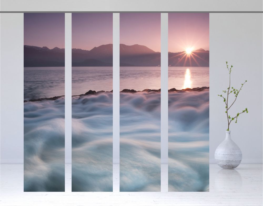 Hier finden Sie einen genialen Flächenvorhang, auch Schiebegardine genannt. Die untergehende Sonne wirft ihr Licht auf das Wasser eines Sees, Nebel steigt auf, die Berge ragen düster in den Abendhimmel. Das Motiv aus dem hohen Norden, aus Skandinavien, lädt zum verweilen ein. Hervorrgend geeignet zum abschalten und ausruhen. Lassen Sie die schönen Farben auf sich wirken. Rundherum ein Genuss und ein echter Gewinn für Ihren Wohnraum.