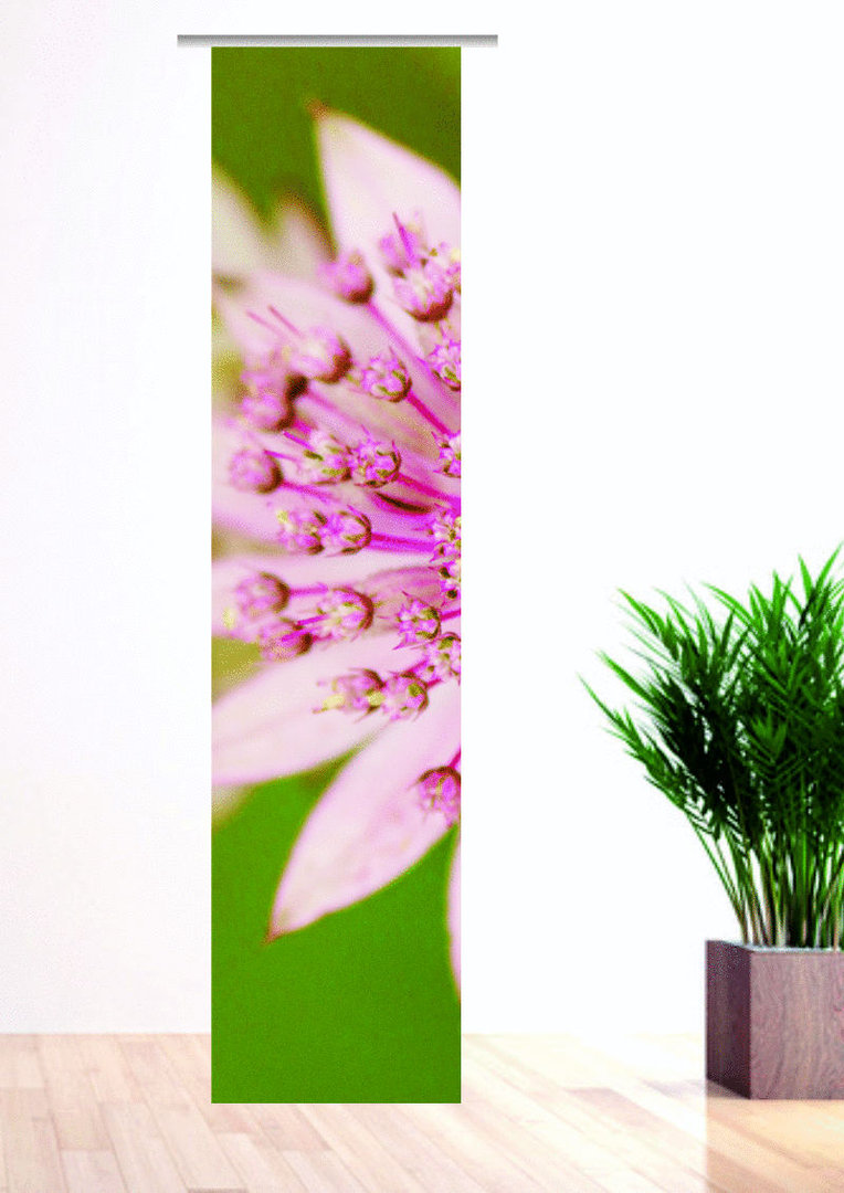 Das Gewebe des Flächenvorhangs besteht zu 100% aus Polyester, die Bedruckung erfolgt im Sublimationsverfahren und garantiert somit ein Maximum an Langlebigkeit.