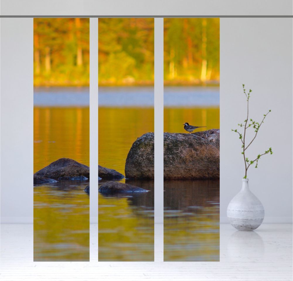 Hier präsentieren wir Ihnen einen exquisiten Flächenvorhang, der durch sein charmantes Motiv aus dem hohen Norden, inspiriert von der skandinavischen Natur, besticht. Die harmonische Komposition aus Wasser, Vögeln und Wald verleiht dem Raum eine beruhigende Atmosphäre, ideal zum Entspannen und Abschalten. Lassen Sie die beeindruckenden Farben auf sich wirken und erleben Sie einen visuellen Genuss, der jeden Wohnraum zu einem echten Hingucker macht.