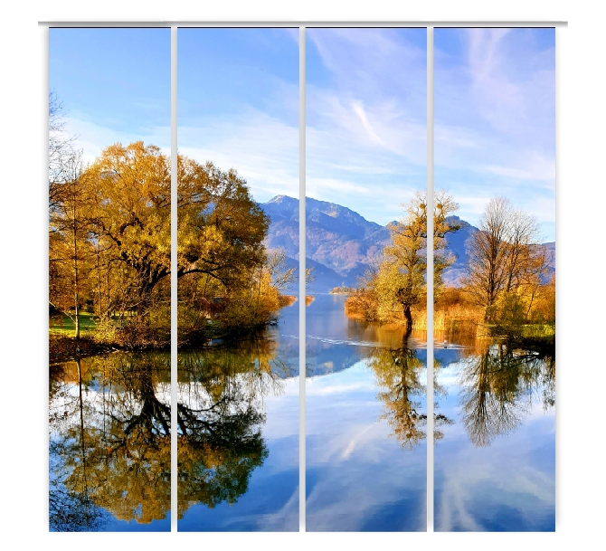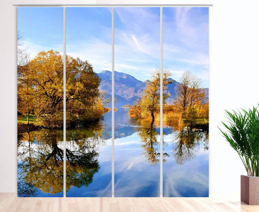 Was sagen Sie denn zu ein paar Veränderungen in Ihrer Wohnung? Würde das nicht an der Zeit sein? Bringen Sie mit neuen Farben und Motiven neuen Schwung in Ihre 4 Wände. Das wird sich auf Ihr Wohlbefinden darin positiv auswirken. Eine neue Fenster-Dekoration macht das schnell möglich. Damit kommt beides in den Wohnraum. Dieser prächtige Flächenvorhang aus unserer eigenen Gardinen-Collektion Made in Thüringen wird Ihre Wohnungseinrichtung perfekt ergänzen und aufwerten. Das Naturmotv ist beeindruckend. Ein See liegt im Zentrum, umgeben von den hohen Bergen der Alpen. Herbststimmung macht sich breit. Eine tolle Atmosphäre wird in Ihrer Wohnung entstehen.