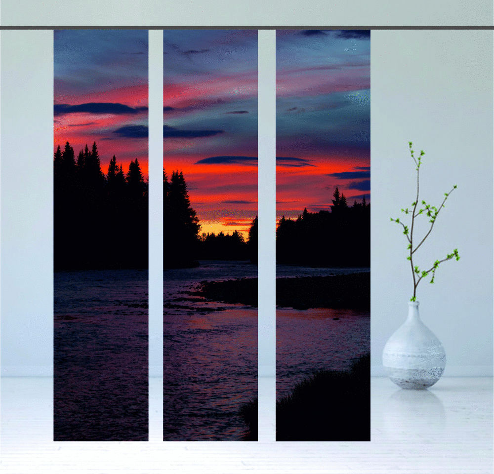 Hier präsentieren wir Ihnen die Flächenvorhang-Serie "Skymning", bestehend aus drei bezaubernden Paneelen, die Sie in die malerische Natur Skandinaviens entführen. Das kunstvolle Motiv vereint Elemente aus Wald, Wasser und einem atemberaubenden Abendhimmel, die zum Verweilen und Entspannen einladen. Die harmonische Farbgebung schafft eine beruhigende Atmosphäre, die ideal zum Abschalten und Ausruhen ist. Lassen Sie die eindrucksvollen Farben auf sich wirken und genießen Sie diesen visuellen Genuss für die Seele.