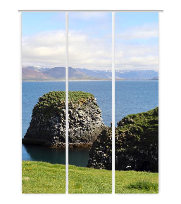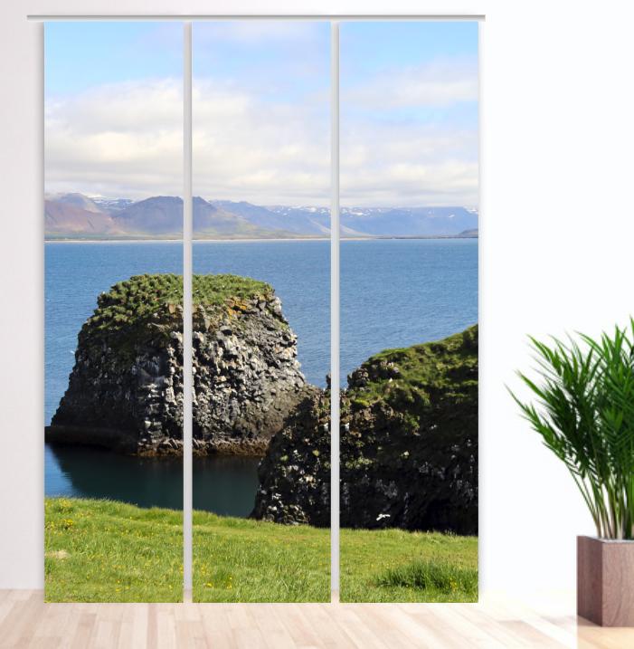 Benötigen Sie weitere Inspirationen für Ihre Inneneinrichtung? Eine Überarbeitung der Fensterdekoration könnte den gewünschten frischen Wind in Ihre Wohnräume bringen. Mit einem außergewöhnlichen Flächenvorhang, der durch sein beeindruckendes Motiv aus Island besticht, können Sie neue Farben und Motive in Ihr Zuhause integrieren. Das Design bietet einen faszinierenden Ausblick über grün bewachsene Felsen auf das blaue Wasser des Meeres und die malerische Küste im Hintergrund. Welche weiteren Dekorationselemente könnten Ihre Wohnräume bereichern? Lassen Sie sich von der Natur inspirieren und schaffen Sie eine harmonische Atmosphäre in Ihrem Heim.