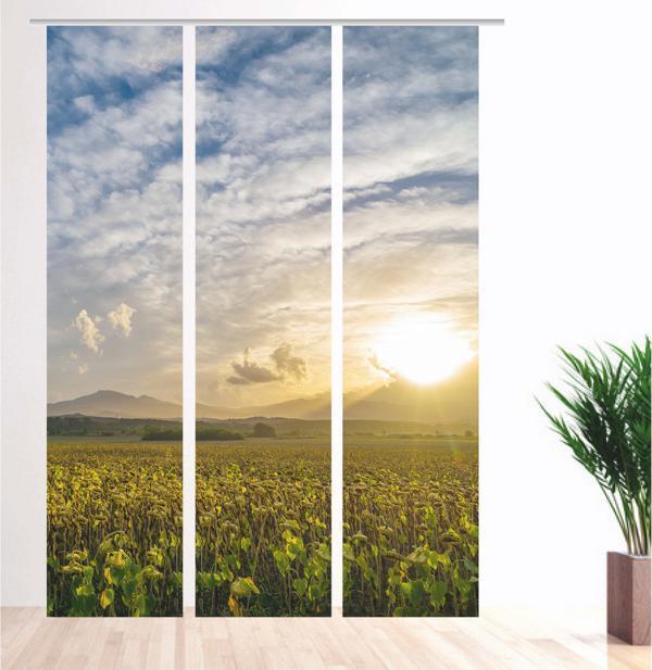 Das Gewebe des Flächenvorhangs besteht zu 100% aus Polyester. Der Druck erfolgt im Sublimationsverfahren und garantiert somit ein Maximum an Langlebigkeit.