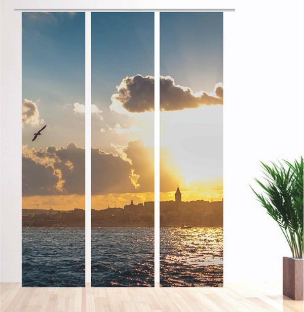 Mit diesem beeindruckenden Motiv, das Istanbul im Licht der untergehenden Sonne zeigt, bringen Sie ein faszinierendes Stück Kunst in Ihr Zuhause, das sowohl Gäste als auch Sie selbst begeistern wird. Es könnte auch Erinnerungen an vergangene Reisen wecken. Unser Flächenvorhang, der Teil unserer exklusiven Gardinen-Kollektion aus Thüringen ist, wird sicherlich Ihre Wohnatmosphäre bereichern und Ihnen Freude bereiten.
